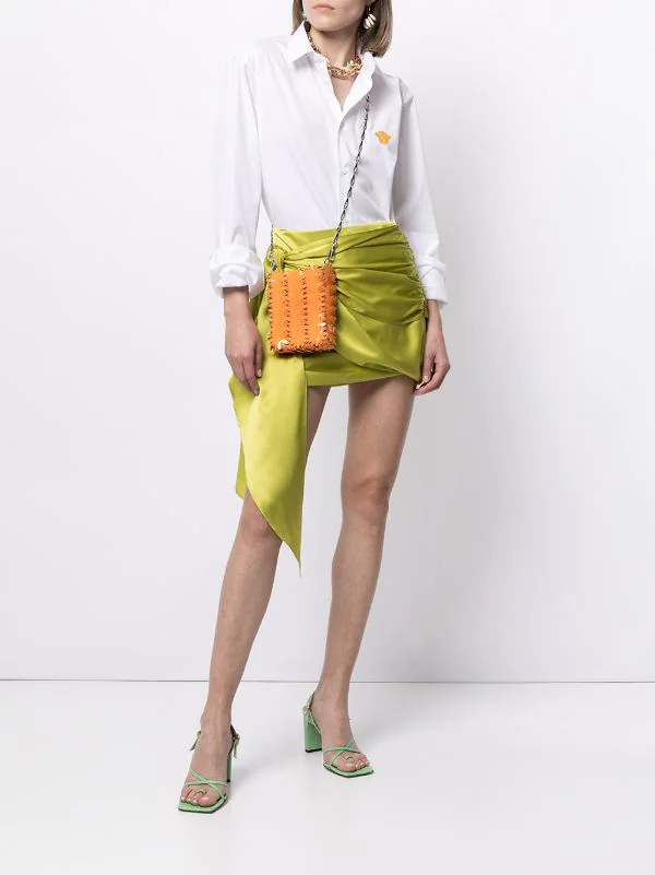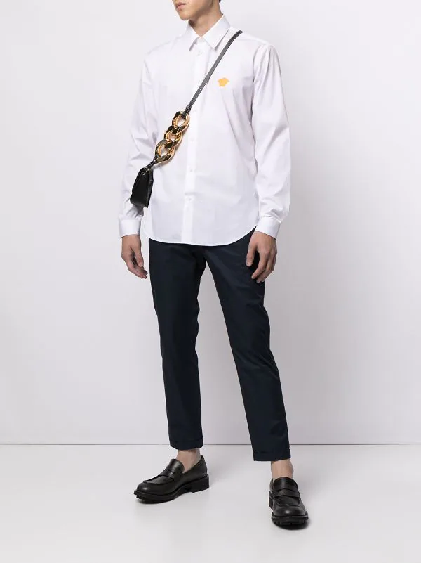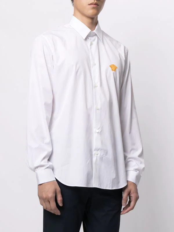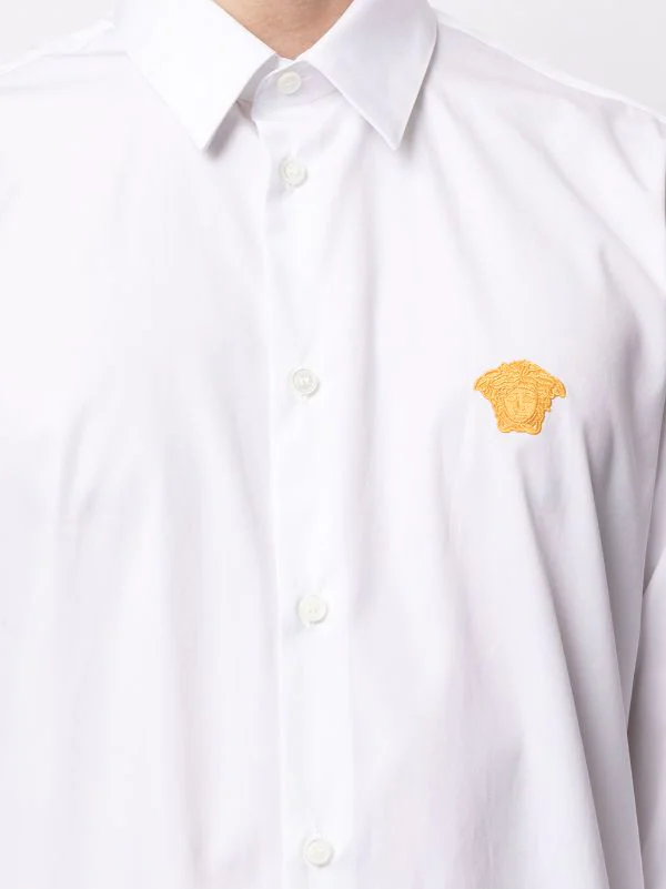 Détail Medusa, col classique, boutonnière sur le devant, ourlet incurvé, manches longues. Couleur : blanc. Matière : coton.