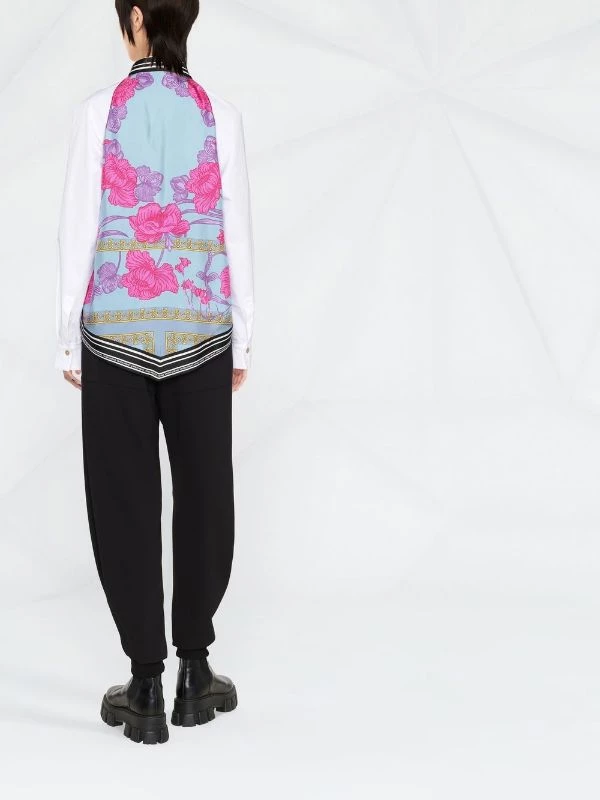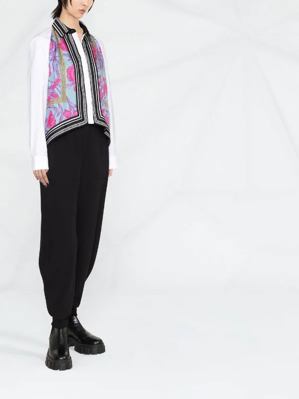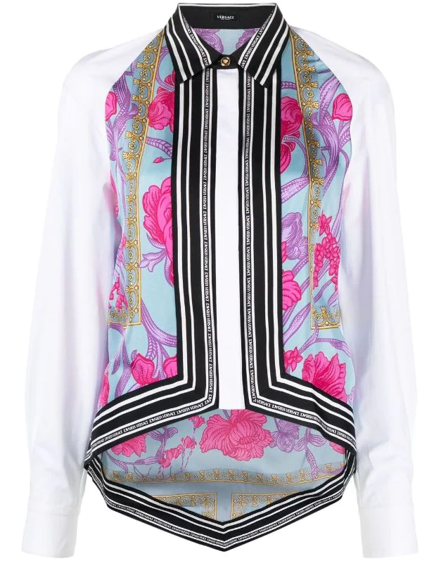 Blanc, soie, logo imprimé et orné, col classique, boutonnière sur le devant, manches à poignets resserrés, ourlet plus long au dos.