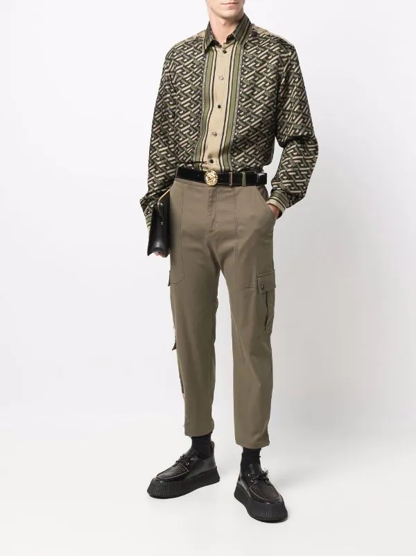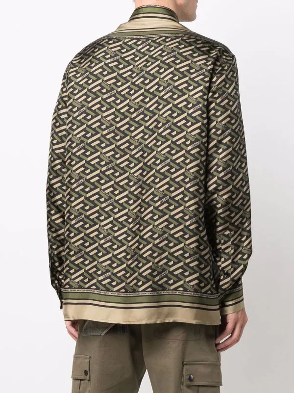 Imprimé géométrique, col classique, boutonnière sur le devant, manches longues, poignets boutonnés, ourlet droit. Matière : soie.
