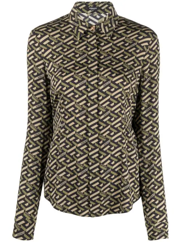 Imprimé géométrique, col classique, boutonnière dissimulée sur le devant, manches longues, poignets boutonnés, ourlet incurvé.