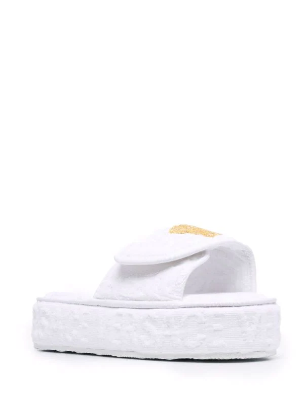 Motif Medusa, motif monogrammé embossé, fermeture scratch sur le devant, semelle à plateforme, design à enfiler. Couleur : blanc.