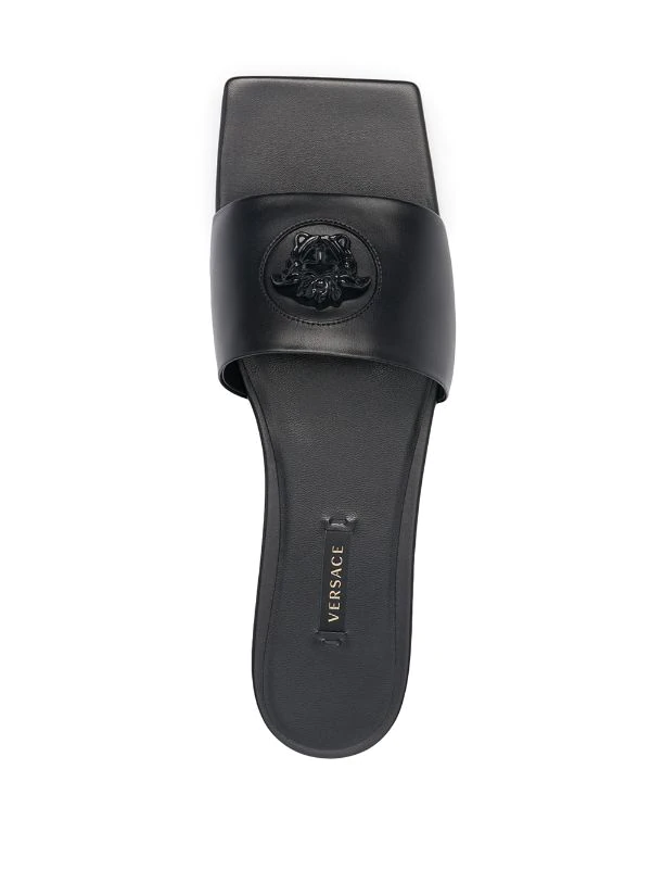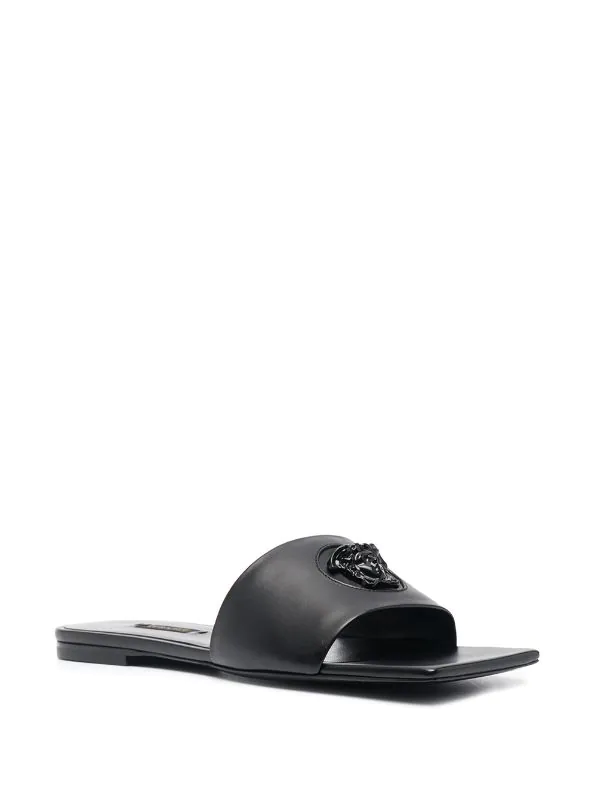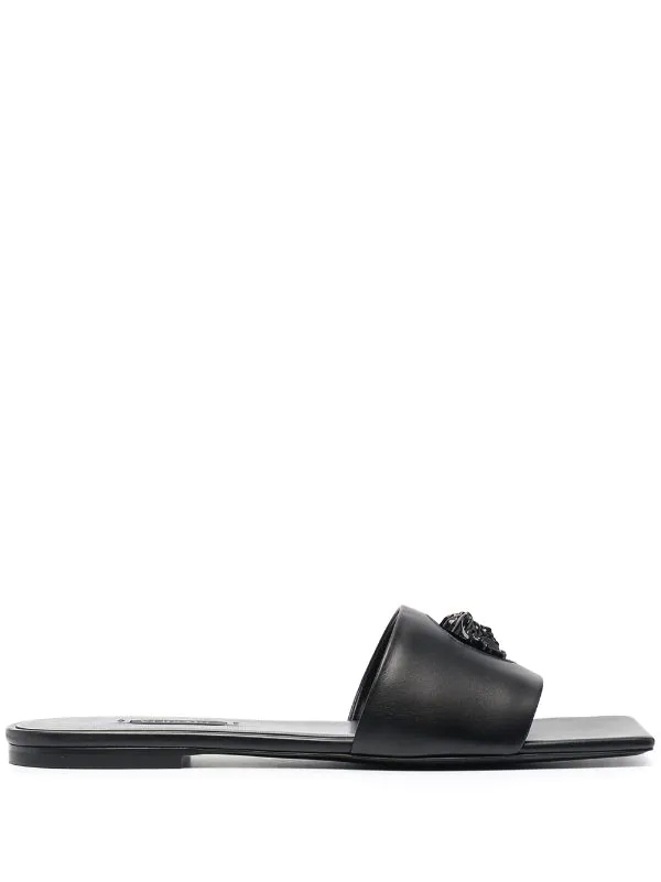 Motif Medusa, bout ouvert, design à enfiler, semelle plate. Couleur : Noir. Matière : cuir.