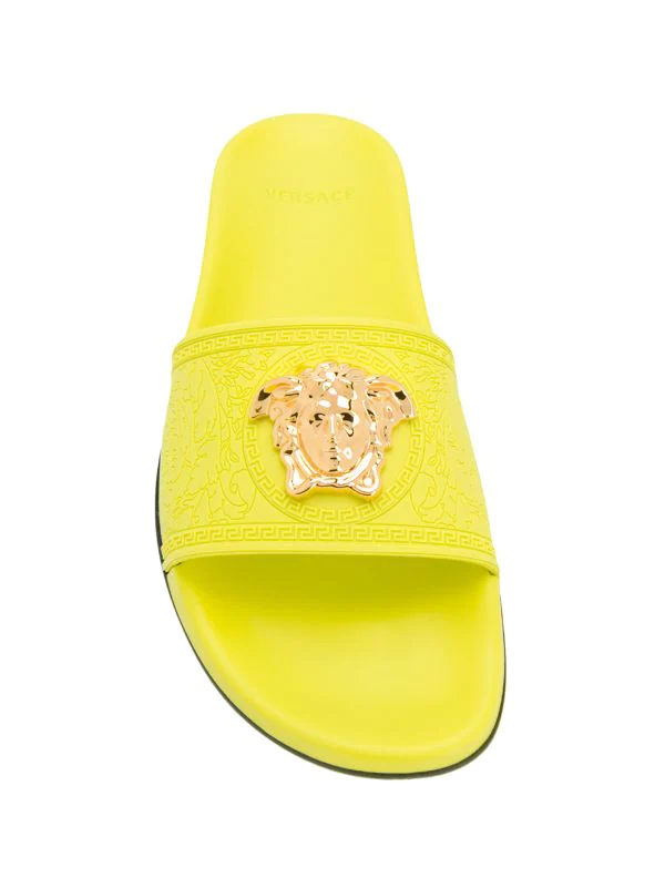 Claquettes à plaque Medusa VERSACE avec un ornement à logo Medusa, semelle intérieure à logo, bout ouvert, design à enfiler et semelle plate en caoutchouc.