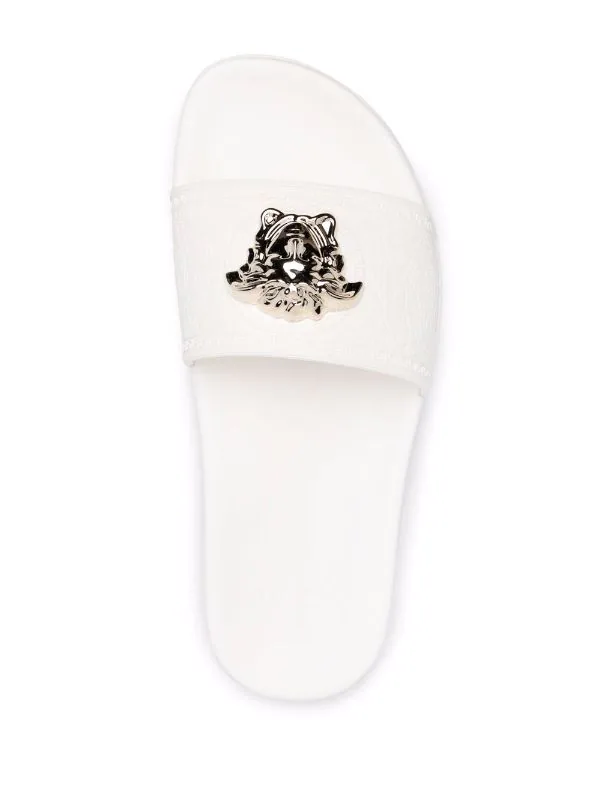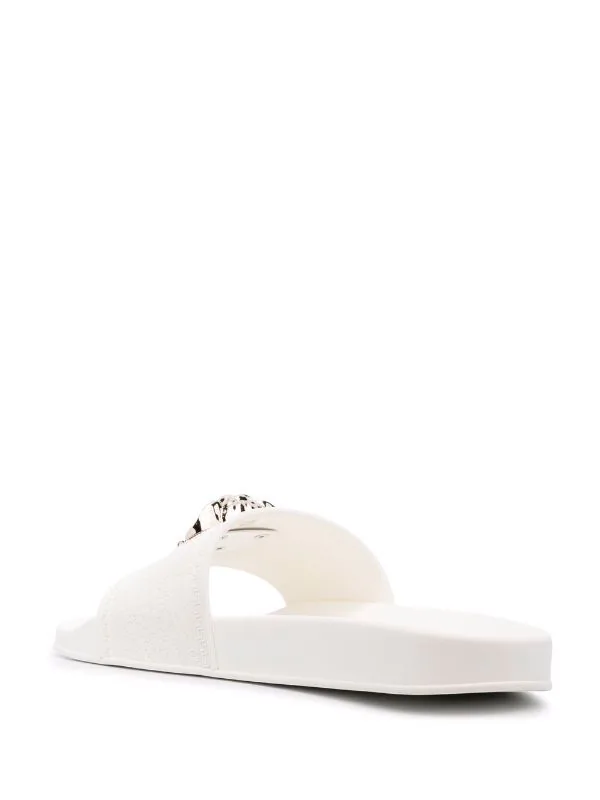 Détail Medusa, bout ouvert, design à enfiler, semelle plate en caoutchouc.
