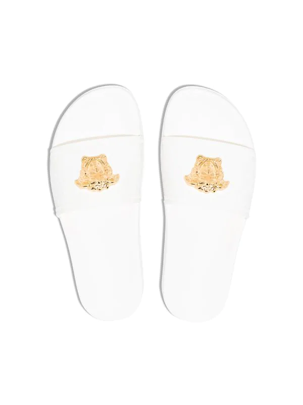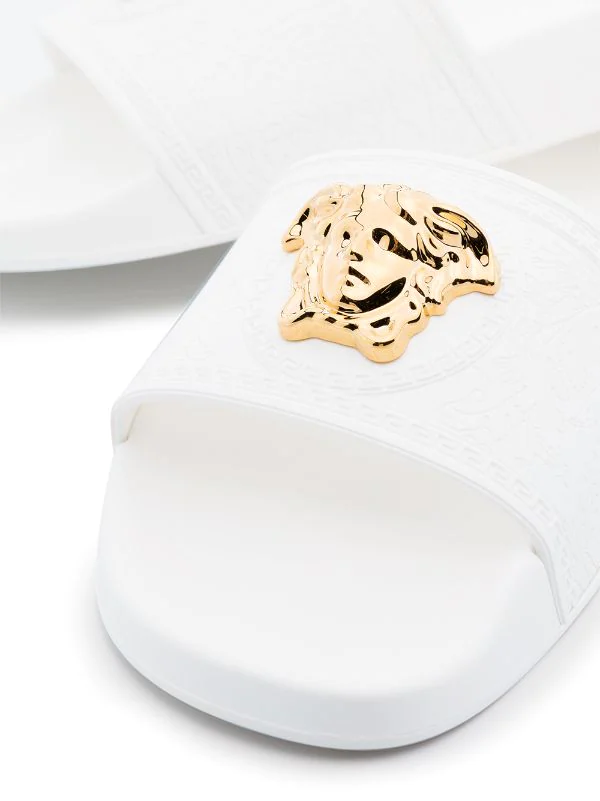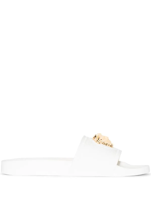 Détail Medusa, finitions en métal doré, bout ouvert, design à enfiler, semelle plate en caoutchouc. Couleur : blanc. Matière : Matériaux Naturels (autre)->Caoutchouc.
