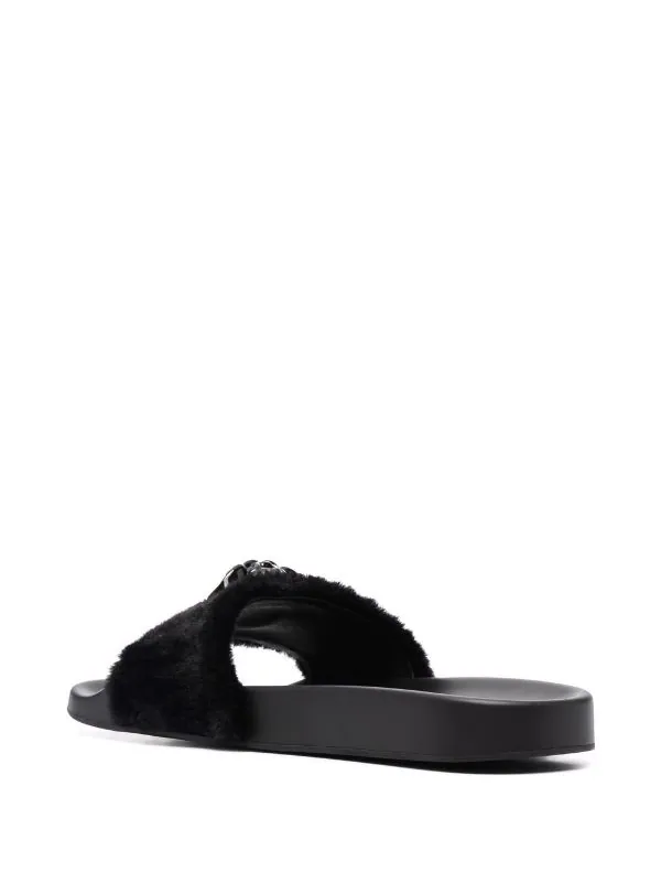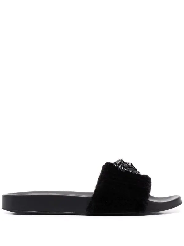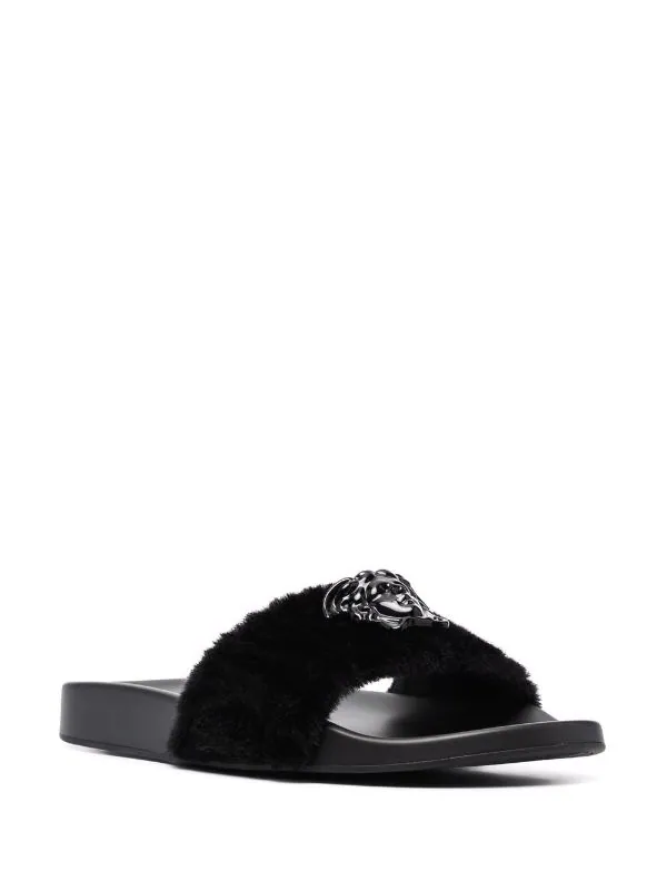 Bout ouvert, semelle intérieure anatomique, finitions en fourrure artificielle, détail Medusa, semelle plate en caoutchouc, design à enfiler. Couleur : noir.