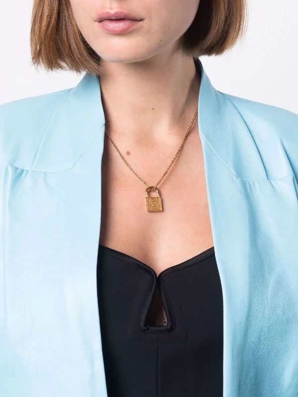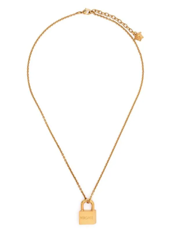 Fermoir mousqueton, chaîne à longueur ajustable, motif Medusa, détail de cadenas. Matière : métal.