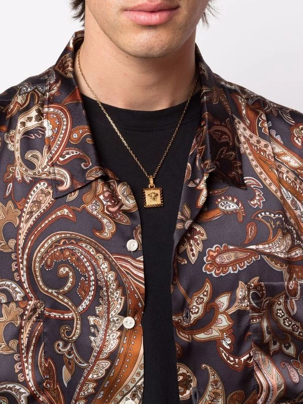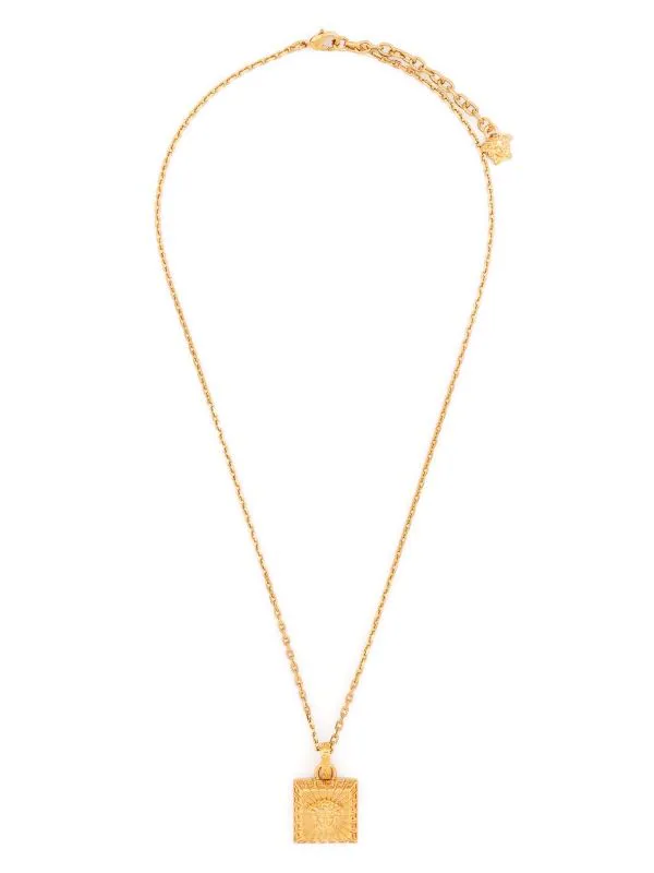Motif Medusa, lanière autour du cou à maillons, fermoir mousqueton, détail de breloque. Matière : métal.