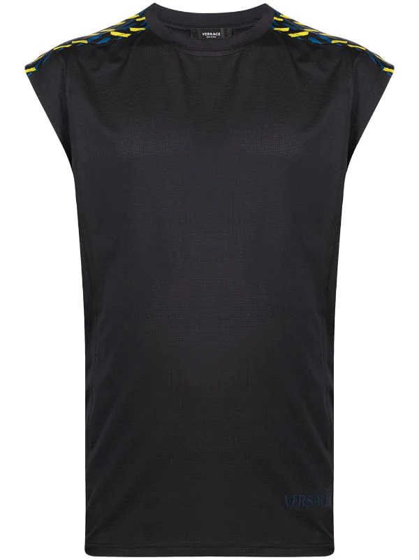 Détail Greca signature, encolure ronde, design sans manches, ourlet droit. Couleur : noir.