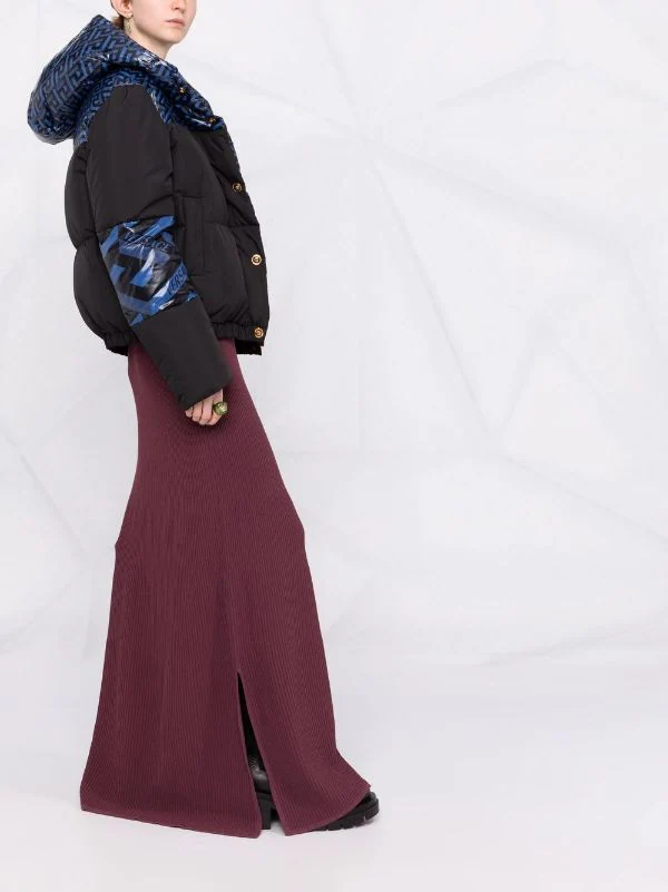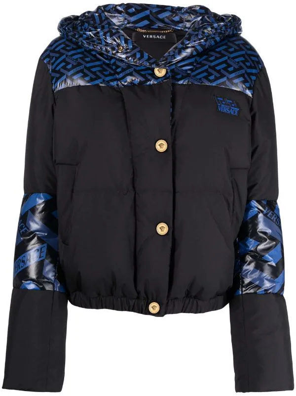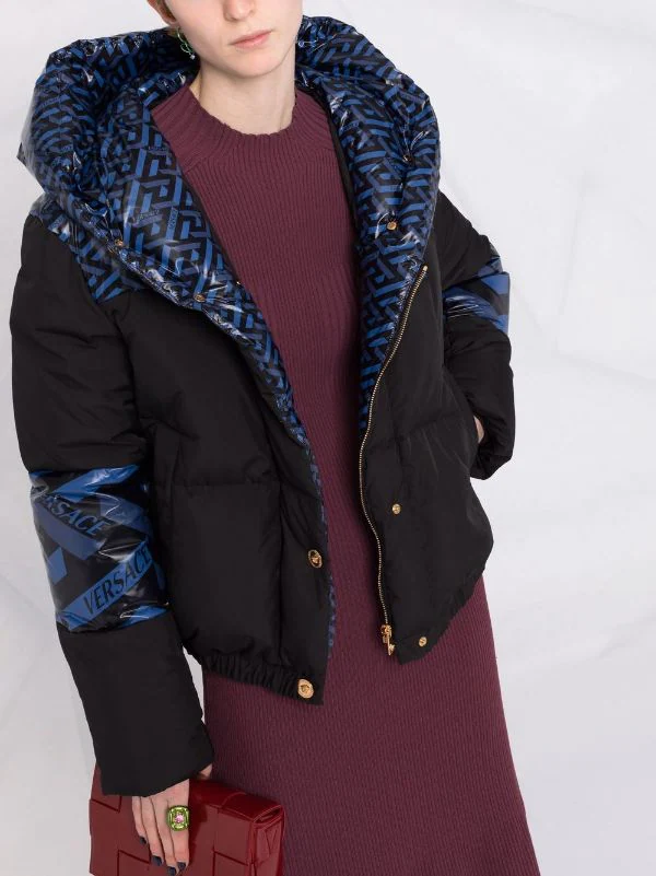 Design matelassé, imprimé La Greca signature, patch poitrine à logo, boutons dorés à détails embossés, capuche classique, manches longues, bouton pression et fermeture zippée sur le devant, deux poches latérales fendues, ourlet élastiqué. Matière : duvet d’oie.