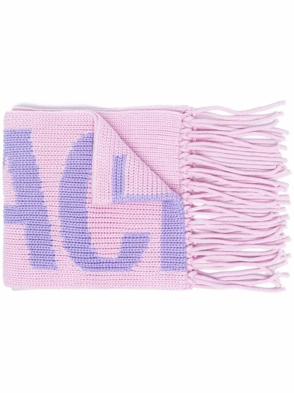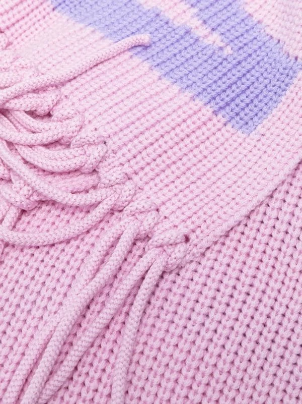 Logo intarsia, maille épaisse, bordures à pompons. Matière : laine.