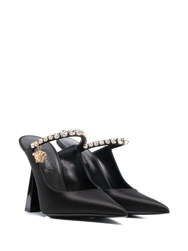 Ornement en cristal, motif Medusa, bout pointu, talon ouvert, talon haut épais. Couleur : noir. Matière : cuir.