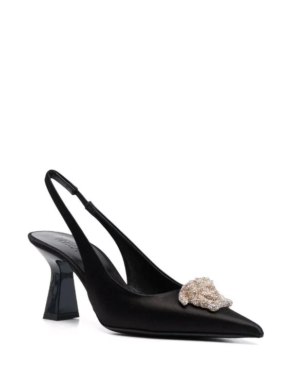Fini satiné, motif Medusa, ornement en strass, bout pointu, bride arrière élastique, semelle intérieure griffée, talon haut. Couleur : noir. Matière : cuir.