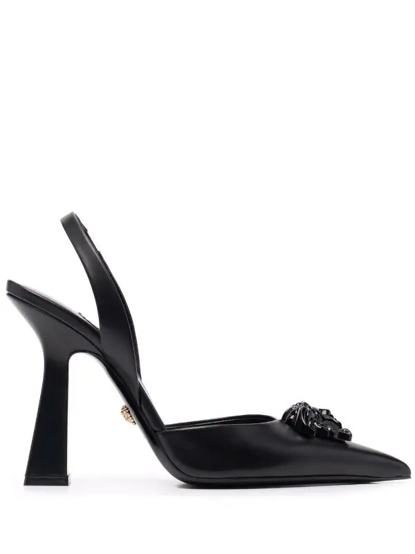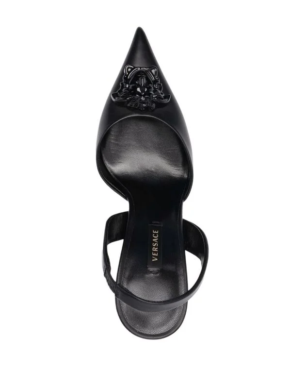 Bout pointu, détail Medusa, semelle intérieure à logo, coutures ton sur ton, bride arrière, motif Medusa, talon sculpté. Couleur : noir. Matière : cuir.
