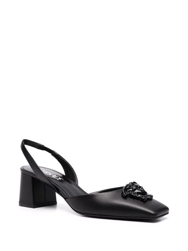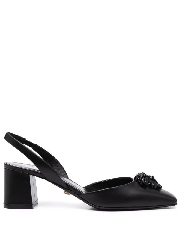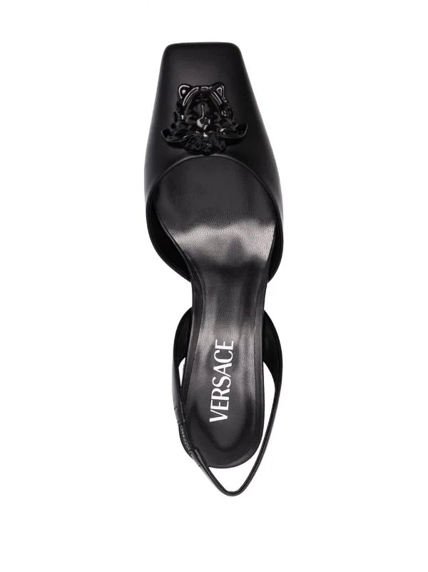 Motif Medusa, bout carré, bride arrière élastique, semelle intérieure griffée, talon mi-haut épais, semelle en cuir. Couleur : noir. Matière : cuir.