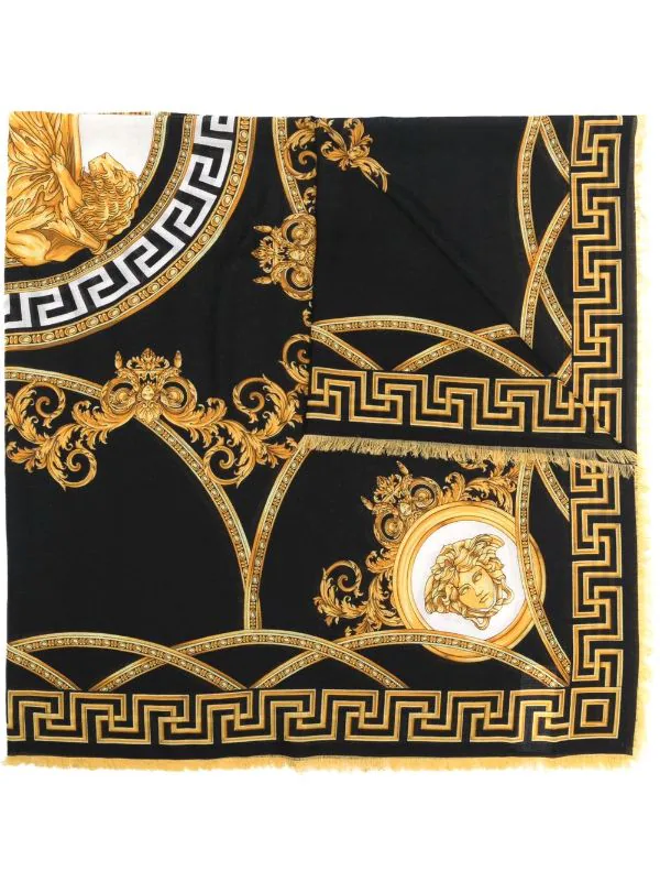 Motif Medusa, motif baroque, motif Greca signature imprimé, bordure à franges. Matière : soie.