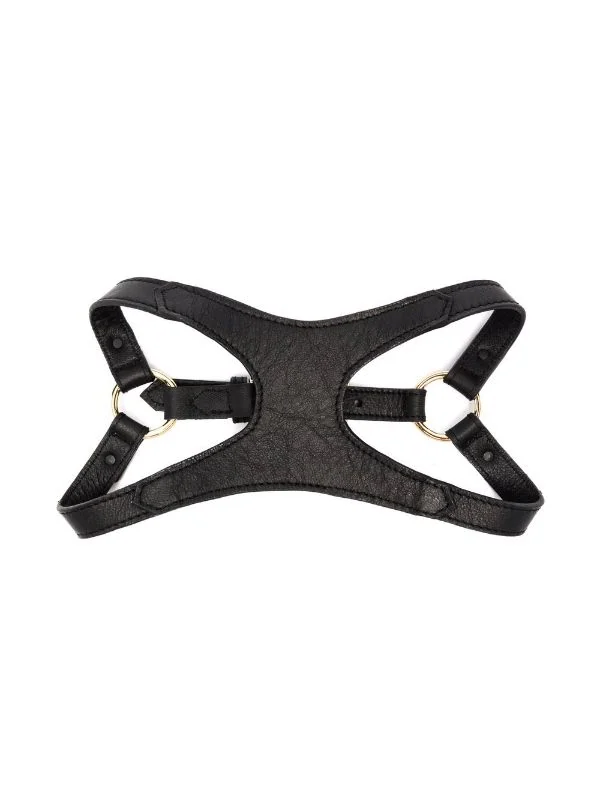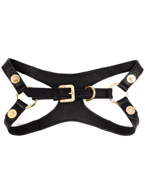 Détail Medusa, fermeture à boucle, taille ajustable. Couleur : noir. Matière : cuir de veau.