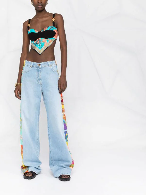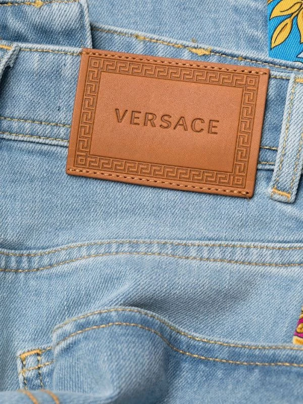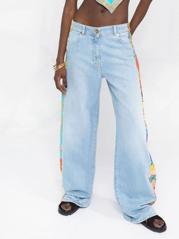 Bleu clair, multicolore, coton mélangé, cuir de veau, motif baroque, empiècements latéraux à détail de logo, patch logo sur l’arrière, coupe ample, passants de ceinture, cinq poches classiques.