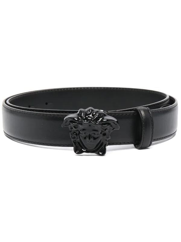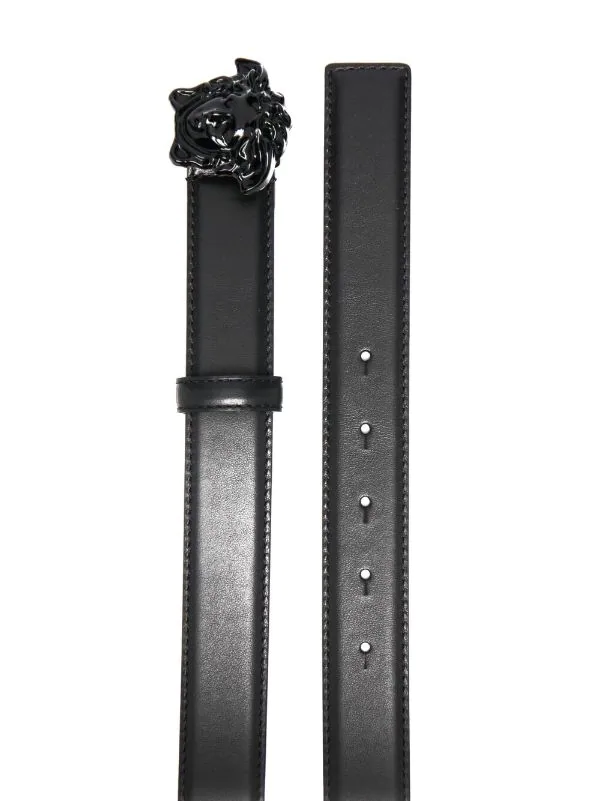 Motif Medusa, branches droites, fermeture à boucle, taille ajustable. Couleur : noir. Matière : cuir de veau.