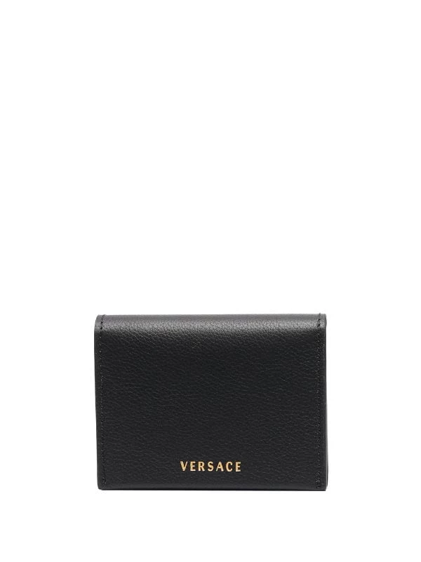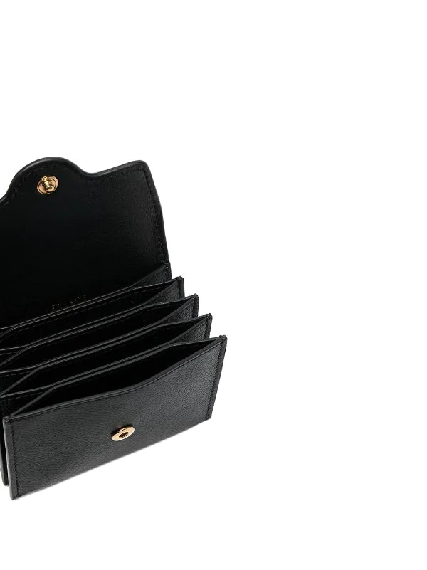 Détail Medusa, finitions en métal doré, fermeture à boutons pression, compartiments intérieurs pour carte. Couleur : Noir. Matière : cuir.