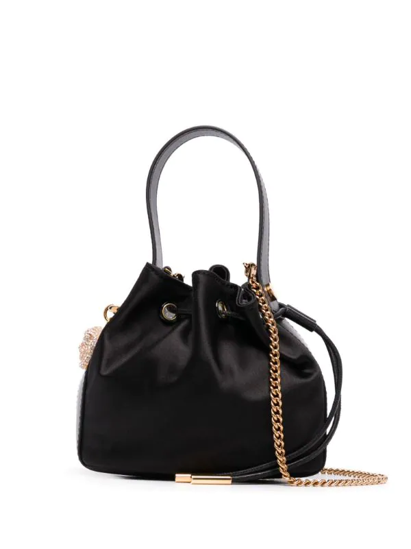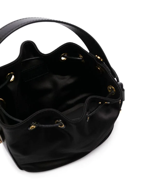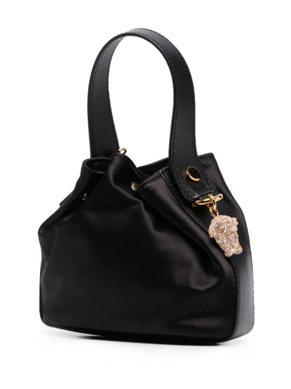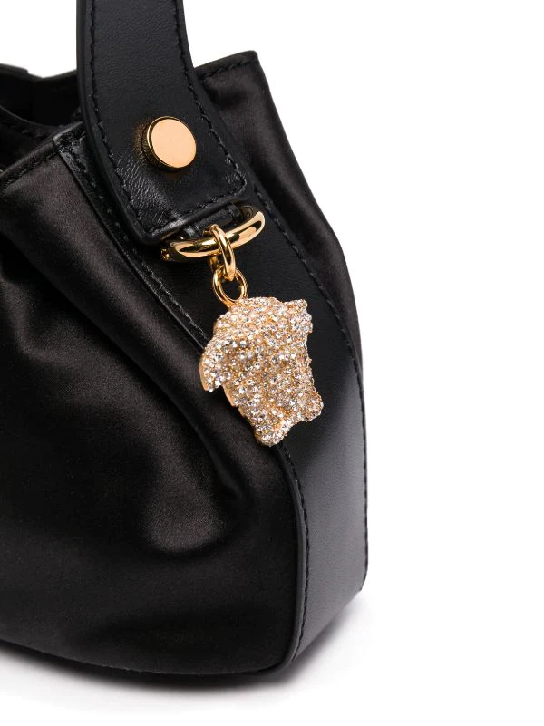 Fini satiné, détail Medusa, ornement en cristal, finitions en métal doré, anse classique, bride porté épaule en chaîne détachable, lien de resserrage, compartiment principal. Couleur : noir. Matière : cuir.