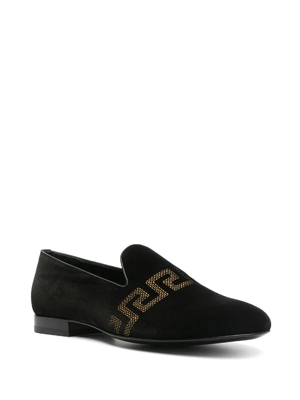 Détail Greca signature, broderies, design à enfiler, bout rond, semelle intérieure à logo, semelle plate en cuir. Couleur : noir. Matière : daim.