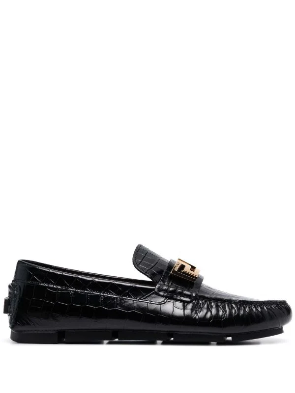 Effet peau de crocodile, bout rond, détail Greca signature, semelle intérieure à logo, patch logo sur l’arrière, semelle à détails de clous. Couleur : noir. Matière : cuir.