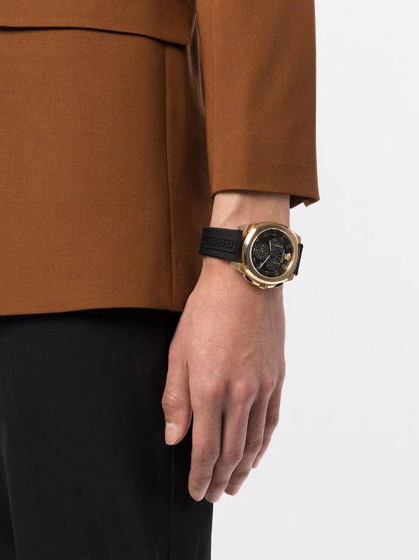 Boîtier rond, mouvement à quartz, bracelet en caoutchouc, fermoir à trou, aiguilles index, couronne vissée, compteurs de chronographe, double bouton poussoir. Couleur : noir. Cet article bénéficie de deux ans de garantie standard proposés par la marque.