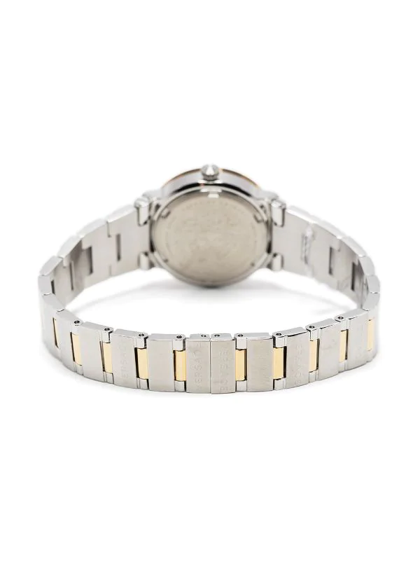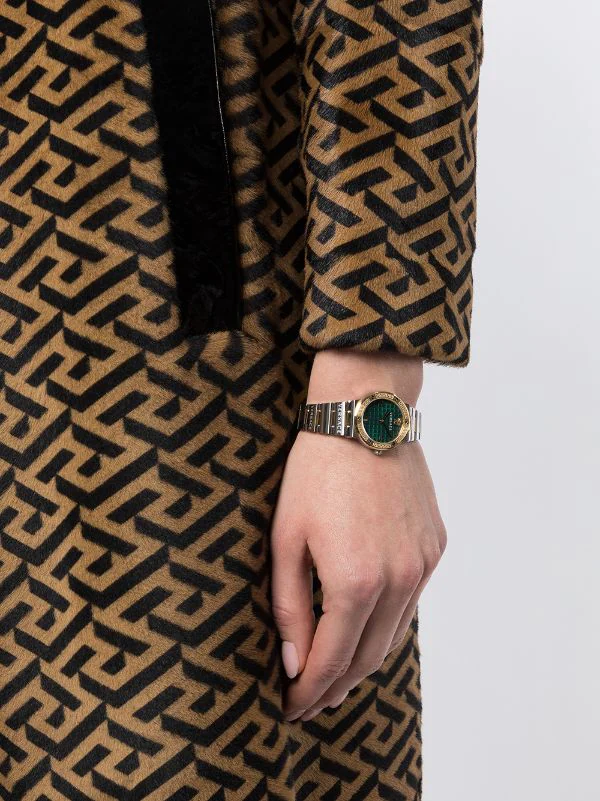 Boîtier rond, mouvement à quartz, bracelet à maillons ajustable, fermeture à loquet, cadran à indicateur, couronne vissée, détail Greca signature, motif Medusa. Matière : acier inoxydable. Cet article bénéficie de deux ans de garantie standard proposés par la marque.