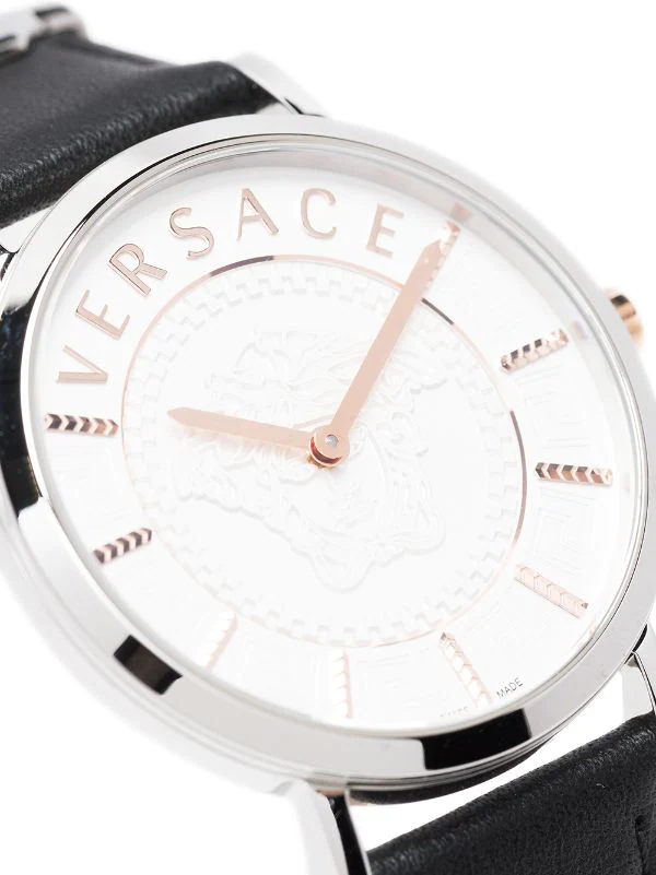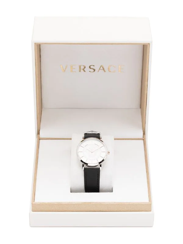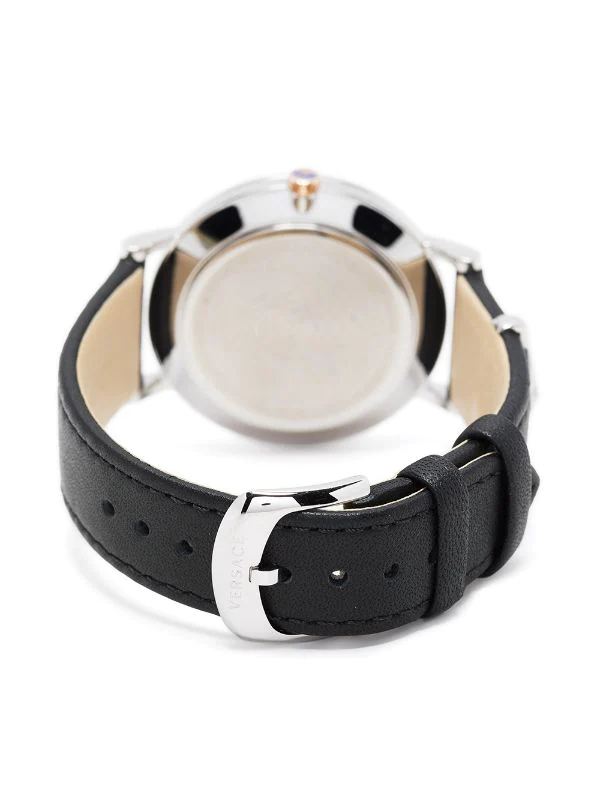 Boîtier rond, mouvement à quartz, bracelet en cuir de veau, fermoir à boucle ardillon, aiguilles index, motif Medusa. Cet article bénéficie de deux ans de garantie standard proposés par la marque.