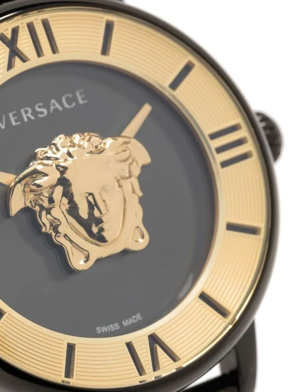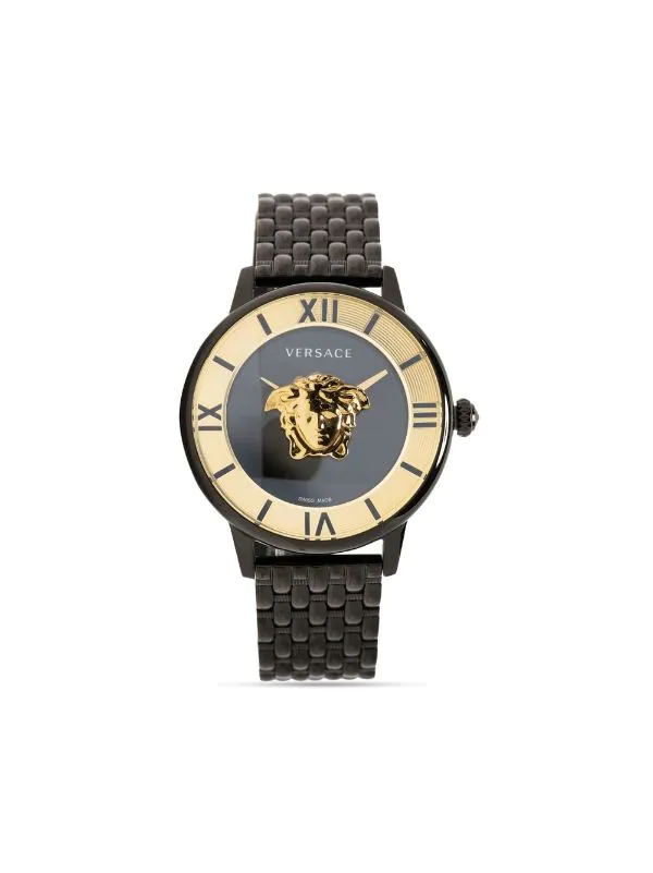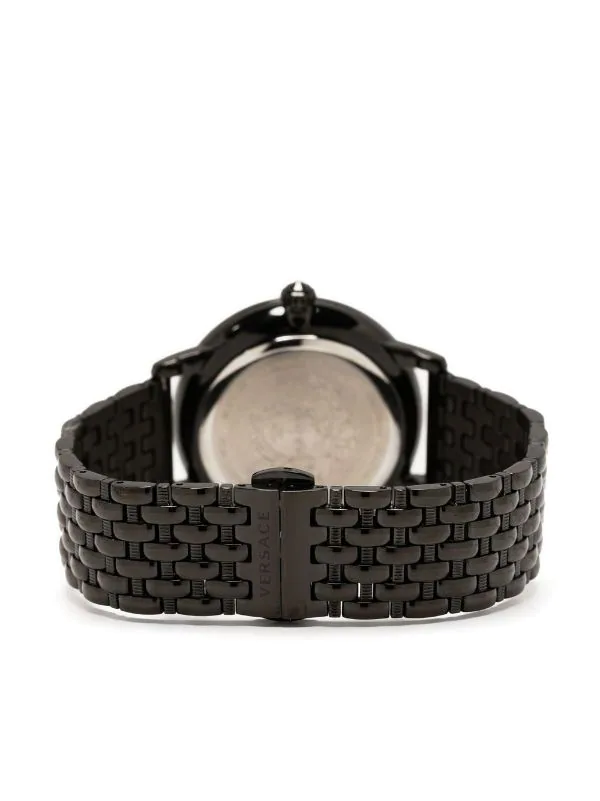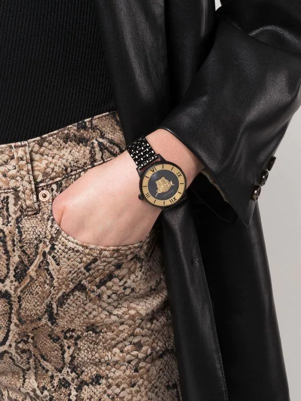 Noir, acier inoxydable, boîtier rond, mouvement à quartz, bracelet à maillons ajustable, fermeture à loquet, motif Medusa, cadran à chiffres romains, aiguilles index, couronne vissée. Cet article bénéficie d’un an de garantie standard proposé par la boutique partenaire.