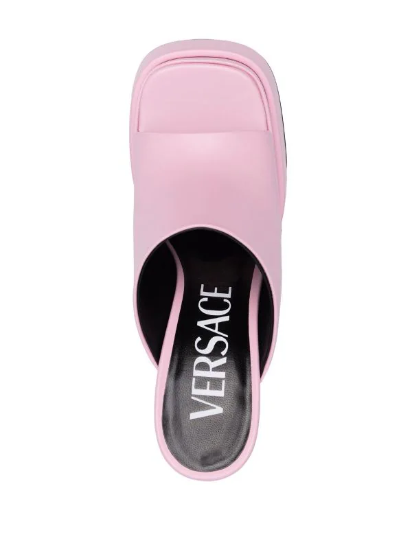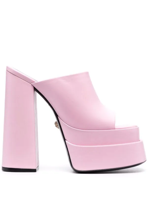 Bout ouvert, dos-nu, design à enfiler, semelle à plateforme, talon haut épais. Matière : cuir.