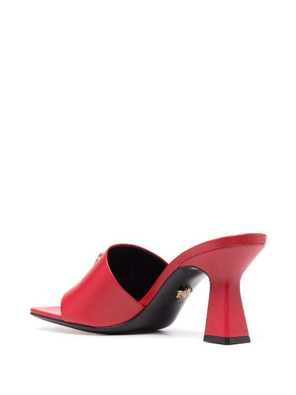 Motif Medusa, bout ouvert, semelle intérieure griffée, talon mi-haut sculpté. Couleur : rouge. Matière : cuir.