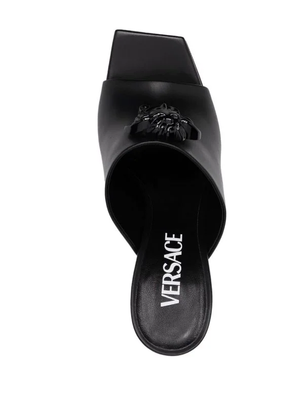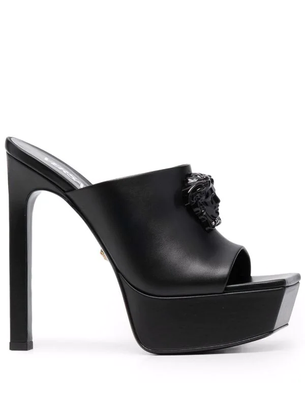 Motif Medusa, semelle intérieure griffée, bout ouvert, semelle à plateforme, talon aiguille haut. Couleur : noir. Matière : cuir.