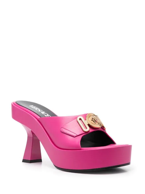 Rose vif, détail Medusa, design à enfiler, bout ouvert, semelle intérieure à logo, talon haut épais.