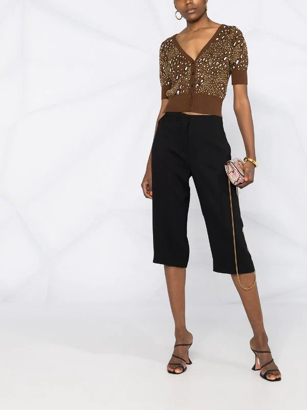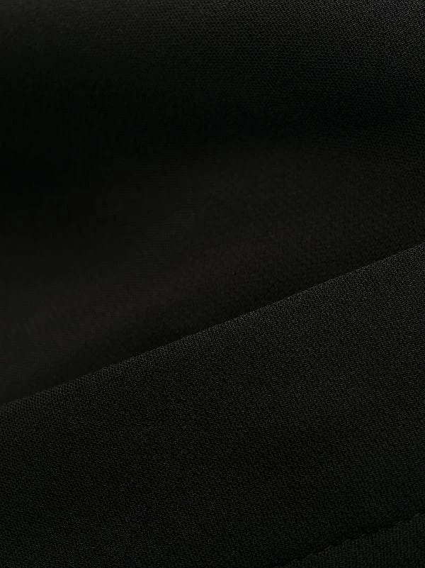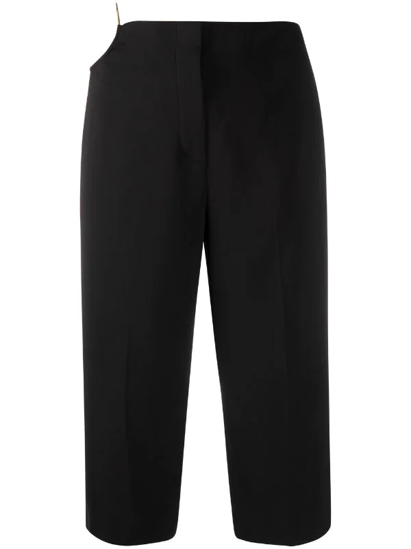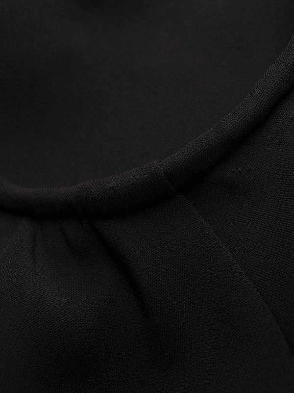 Détails de découpes, fermeture dissimulée sur le devant, poche latérale passepoilée, longueur crop. Couleur : noir.