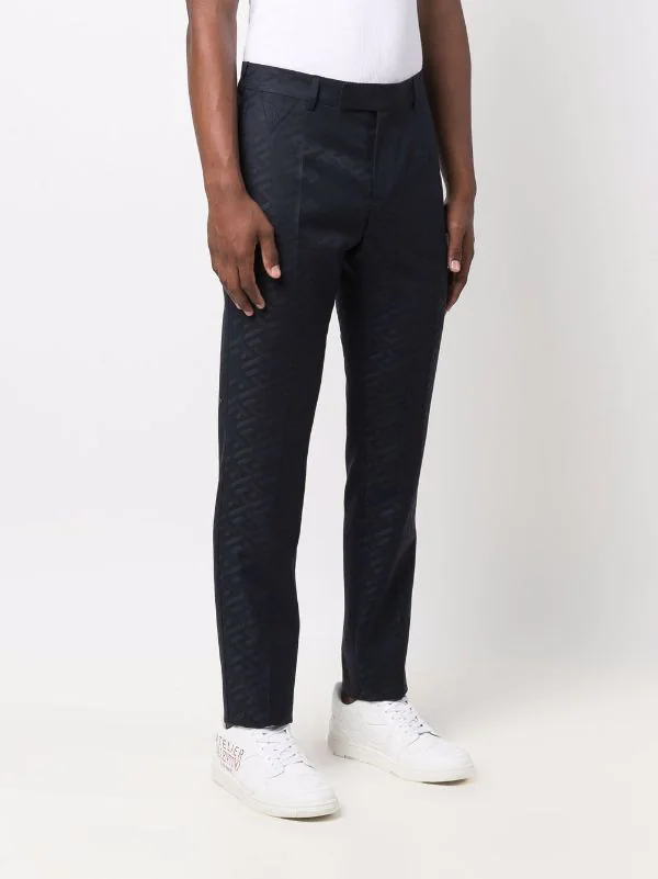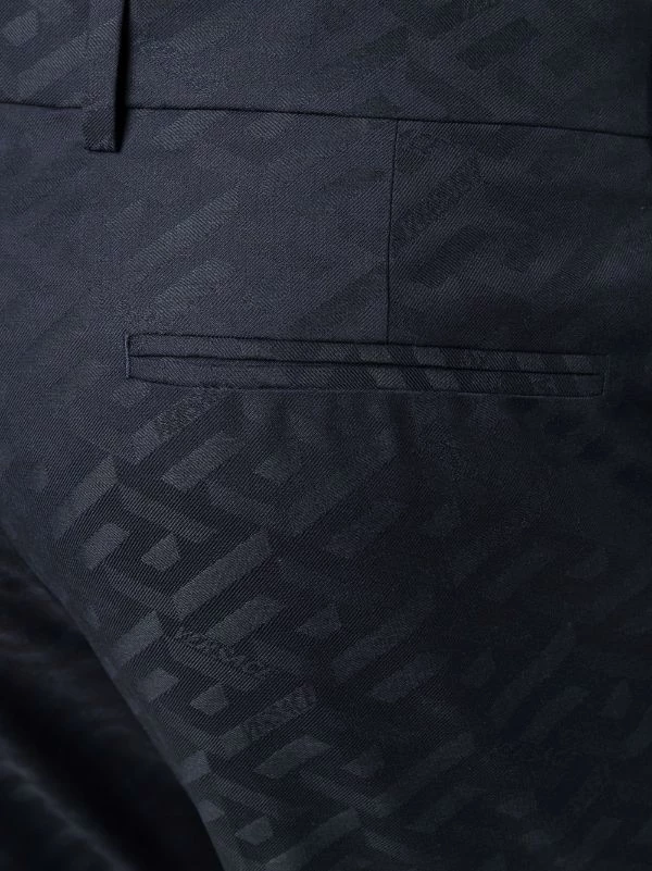 Motif monogrammé, passants de ceinture, fermeture à œillets et agrafes, poches latérales fendues, deux poches passepoilées à l’arrière, coupe droite.