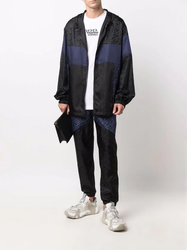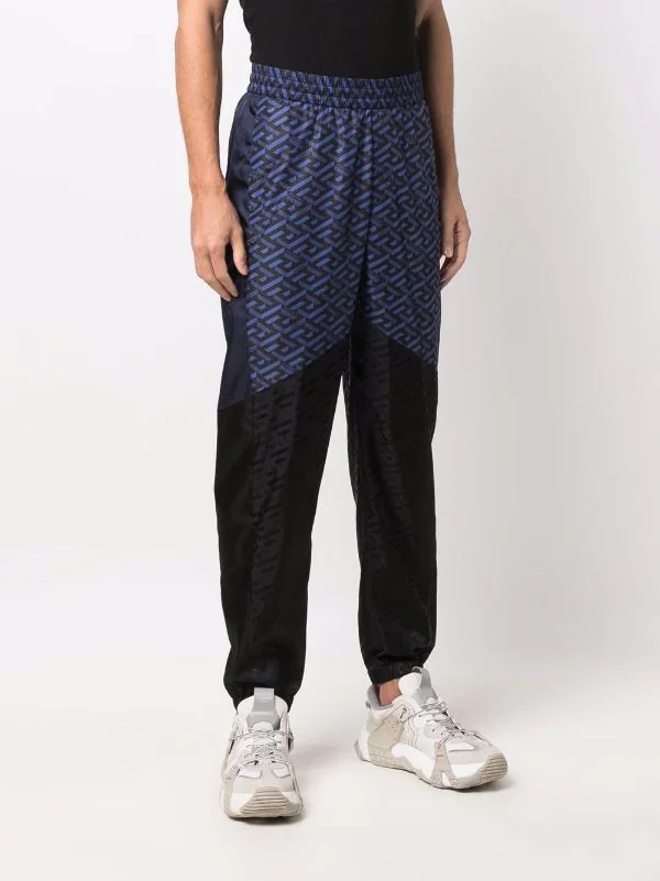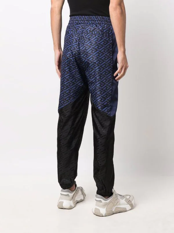 Motif géométrique, design à empiècements, ceinture élastique, poches arrière passepoilées, chevilles élastiques.