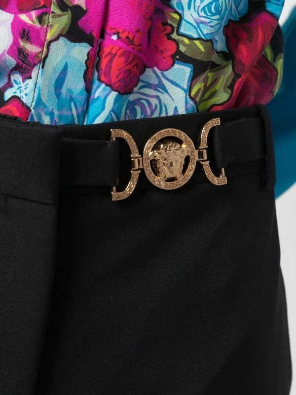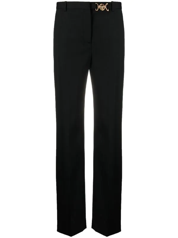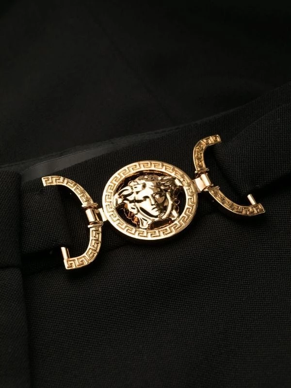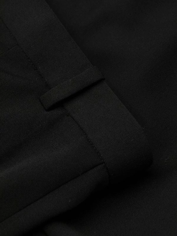 Plaque logo dorée, fermeture dissimulée sur le devant, passants de ceinture, deux poches latérales fendues, poches arrière passepoilées. Couleur : noir.