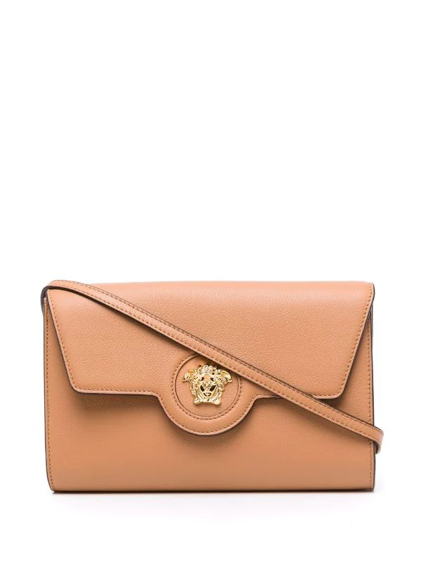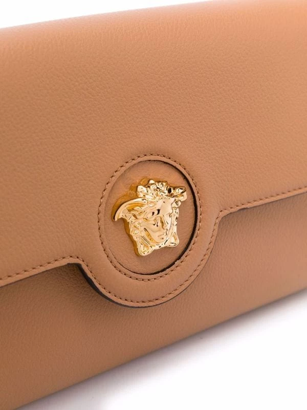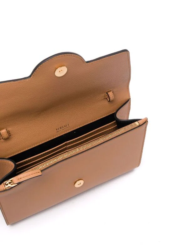 Détail Medusa, finitions en métal doré, rabat sur le dessus à fermeture magnétique, compartiment principal, bretelle fine. Couleur : marron. Matière : cuir.