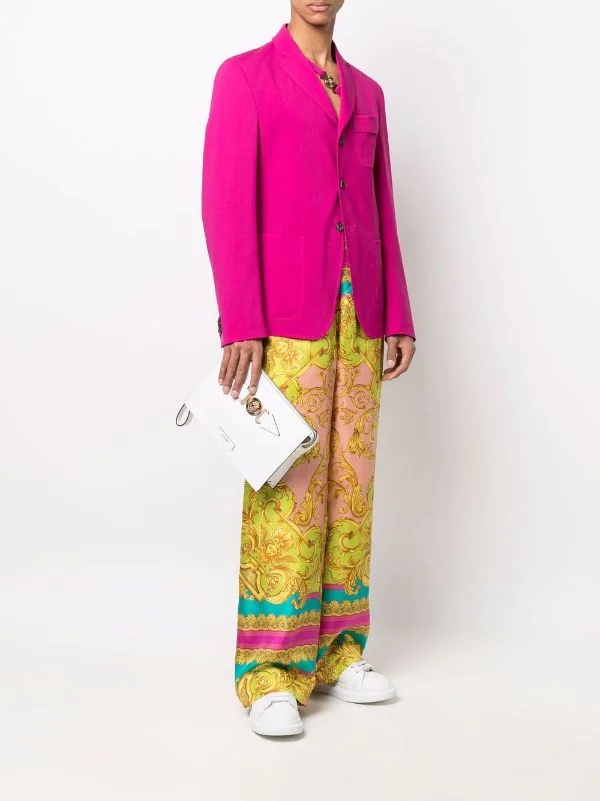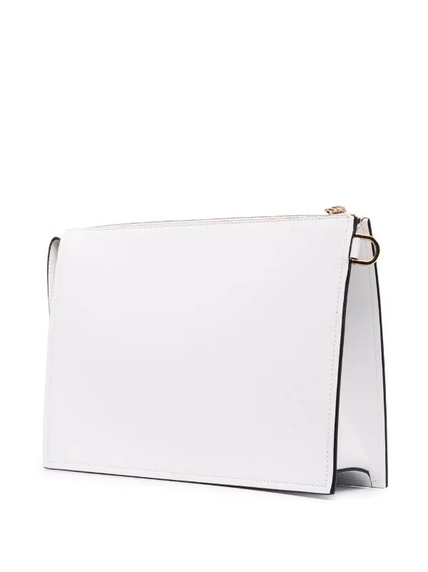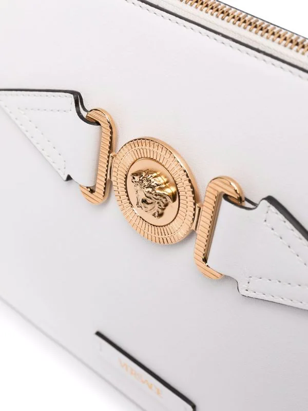Motif Medusa, logo embossé sur le devant, fermeture zippée sur le dessus, compartiment intérieur, poches intérieures zippées, anse-dragonne détachable. Matière : cuir.