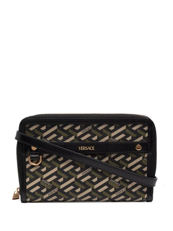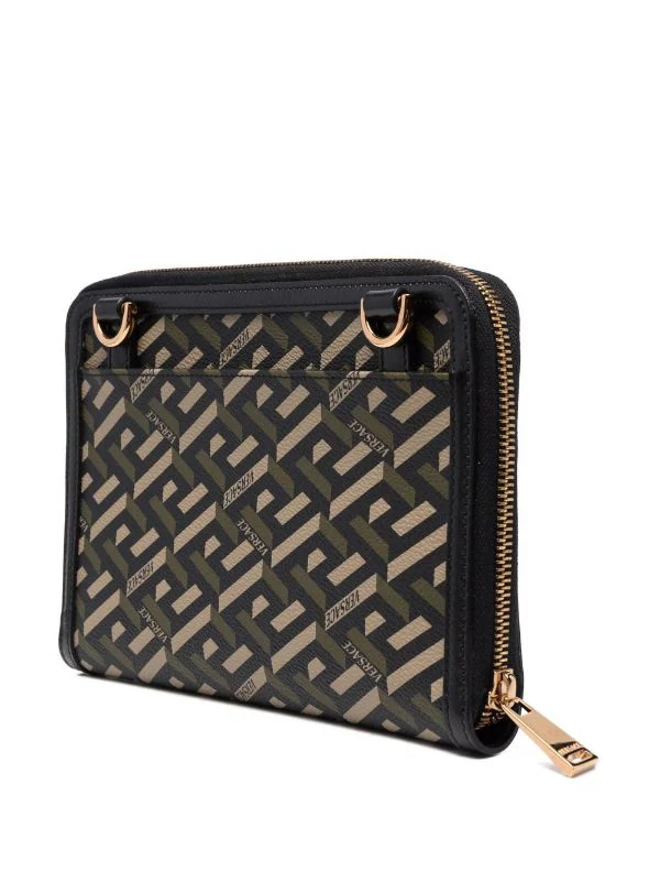Détail Greca signature, fermeture zippée sur le dessus, finitions en métal doré, poche intérieure. Matière : cuir.