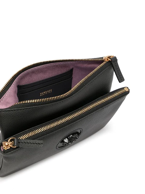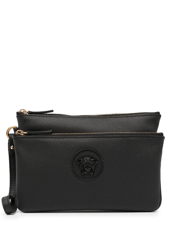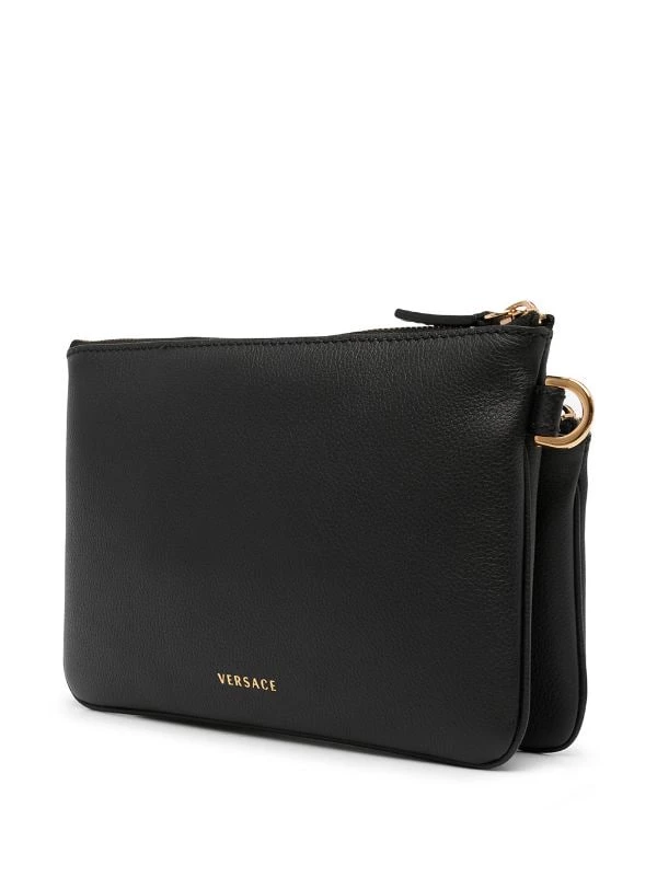 Détail Medusa, fermeture zippée sur le dessus, bride porté poignet, poche zippée sur le devant, compartiments intérieurs pour carte. Couleur : noir. Matière : cuir.