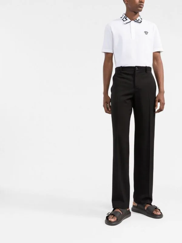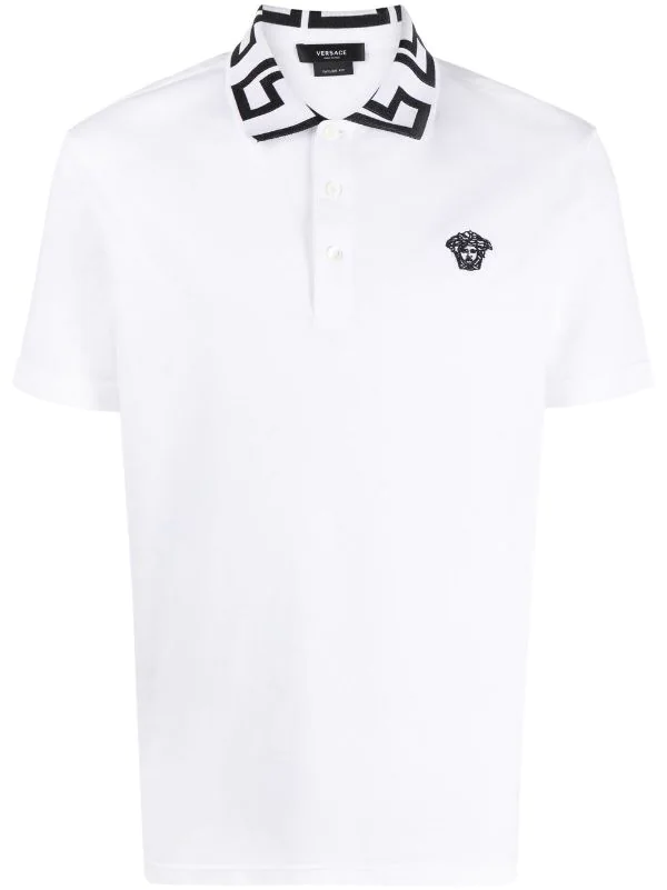 Noir/blanc, coton, motif Medusa, imprimé La Greca signature, col polo, patte de boutonnage sur le devant, manches courtes, ourlet droit.