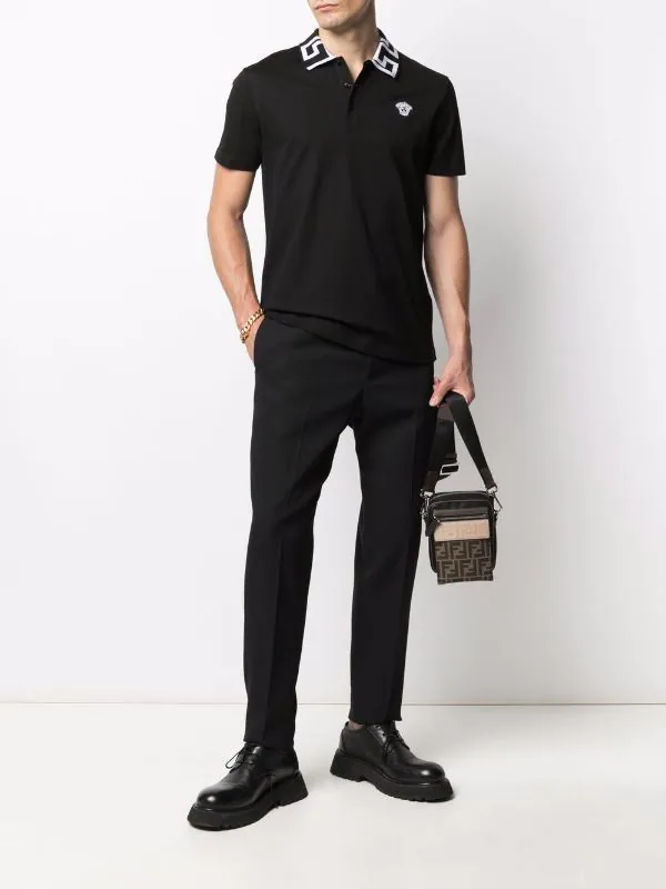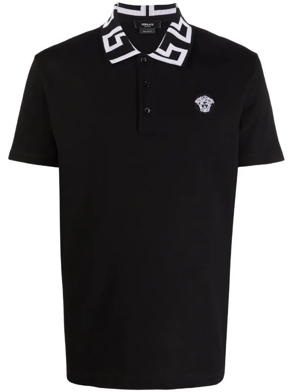 Col polo, patte de boutonnage sur le devant, détail Medusa, manches courtes, poignets nervurés, détail Greca signature, ourlet droit. Matière : coton.
