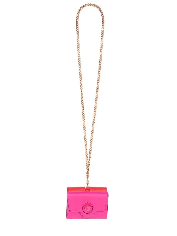 Motif Medusa, rabat sur le dessus, compartiment principal, lanière autour du cou à maillons. Matière : cuir de veau.