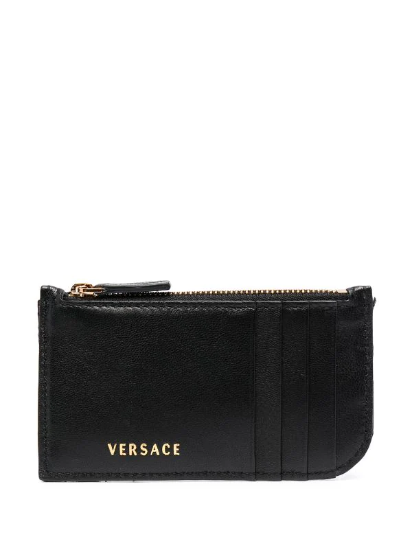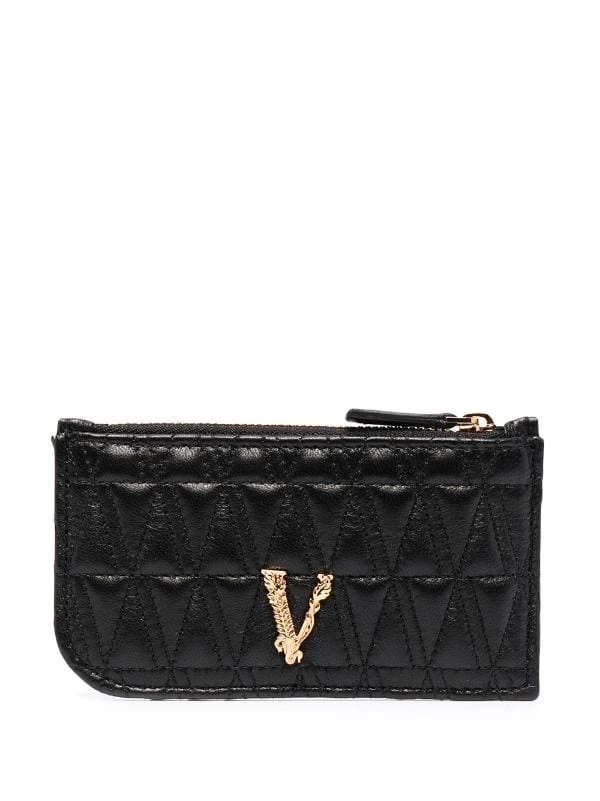 Effet matelassé, logo embossé, plaque logo dorée, fermeture zippée sur le dessus, fentes pour carte, anneau porte-clés. Couleur : noir. Matière : cuir.
