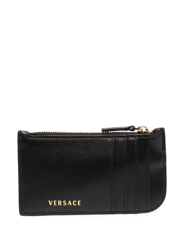 Plaque logo dorée, logo embossé, fermeture zippée sur le dessus, fentes pour carte. Couleur : noir. Matière : cuir.