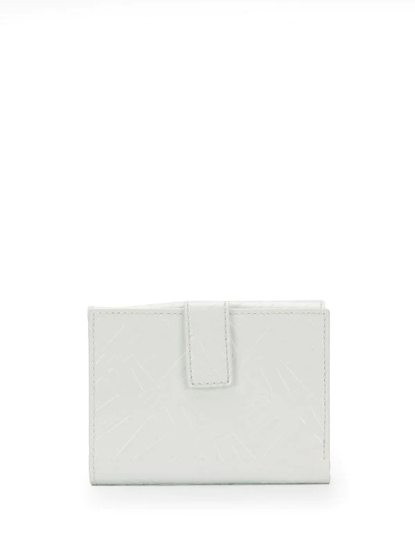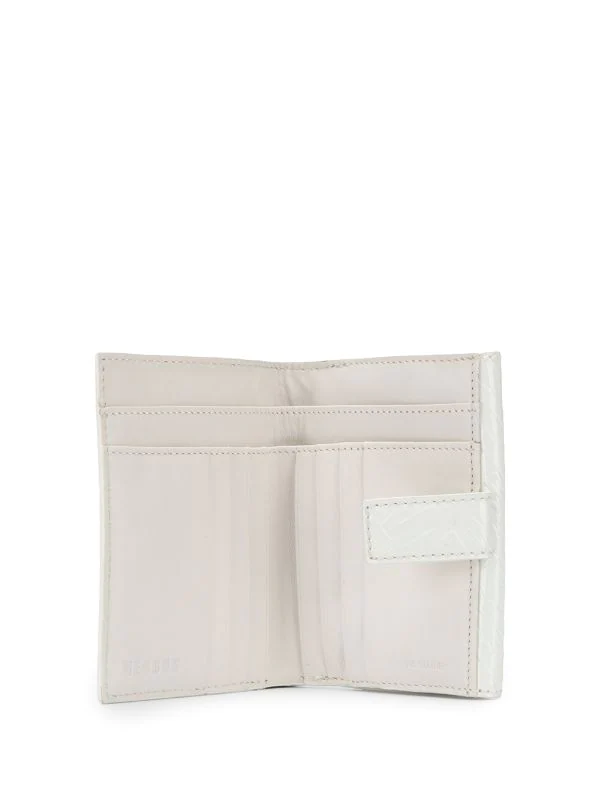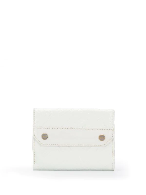 Portefeuille à rabat en cuir verni Versus avec an engraved logo, poches intérieures, languette de fermeture sur le côté et multiple interior card slots. Couleur : blanc.