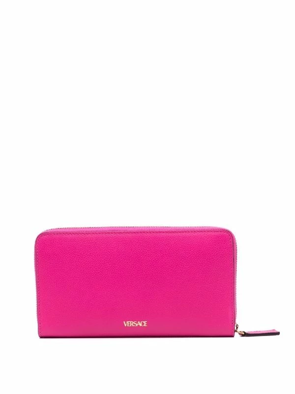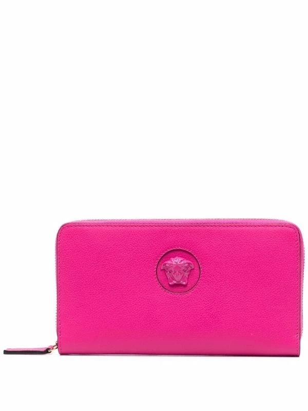 Détail Medusa, fermeture zippée sur le dessus, compartiments intérieurs pour carte, compartiment à billets intérieur, poche intérieure zippée. Couleur : rose. Matière : cuir.